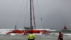 21 nov 2022 Difícil rescate en la costa de Corrubedo de un regatista francés que hacía la Ruta del Ron El trimarán embarrancó en la playa de A Ladeira, pero el tripulante resultó prácticamente ileso M. X. Blanco / C. Sóñora / Elena Silveira