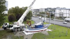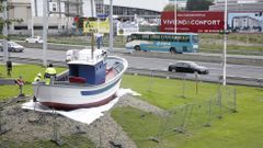 08 nov 2016 El pesquero «Atalaya» ya da la bienvenida a los que entran en la ciudad por Alfonso Molina El cerquero sadense fue trasladado en un transporte especial desde Oza Emiliano Mouzo