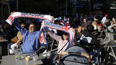 13 abr 2026 Aficionados del Obra en la praza Roxa para ver el derbi entre el Básquet Coruña y el Obradoiro en la pantalla instalada por el Concello Paco Rodríguez