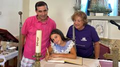 La cofradía de Santa Ana presenta este año un libro de gracias y favores que estrenó la pequeña Indira, de 9 años, que escribió unas palabras en presencia de su padre, Fernando Aradas, y de Lucía García, presidenta de la comisión de las fiestas que comienzan este jueves