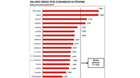 El informe también recoge que el salario medio bruto nacional ha crecido el 0,4% entre 2014 y 2015. Aunque la mejoría es moderada, es el mejor dato de los seis últimos años. Las cifras indican que los trabajadores asturianos cobran, de media, 1.591 euros brutos, 49 euros mensuales por debajo de la media del país. A pesar de ello, solo cuatro comunidades autónomas tienen salarios medios más altos (País Vasco, Navarra, Madrid y Cataluña) que el Principado. En el otro extremo, se encuentran Extremadura, Canarias, Galicia y Murcia, las regiones con los sueldos más bajos.