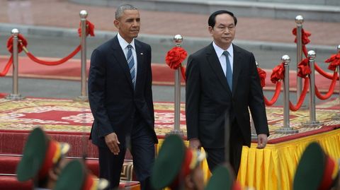 Obama se reunió en la mañana de hoy con su homólogo vietnamita, Tran Dai Quang, en el Palacio Presidencial de Hanoi, para departir sobre asuntos económicos, derechos humanos y el conflicto territorial que Vietnam mantiene con China en el Mar de China Meridional.
