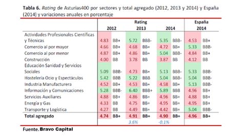 28 jun 2016 . Actualizado a las 21:51 h.Las empresas del Principado han aumentado su rating hasta alcanzar casi los 5 puntos, quedándose en una media de 4,90 en el año 2014. Así lo ha desvelado el informe Asturias400, elaborado por Bravo Capital y presentado por José Luis Villafranca, director de la consultura Bravo Capital y Alberto González, director general de la FADE. Los sectores que han obtenido las mejores calificaciones, superiores a 5, han sido Información y Comunicaciones y Actividades Profesionales Científicas y Técnicas, con 5,89 y 5,35, respectivamente.