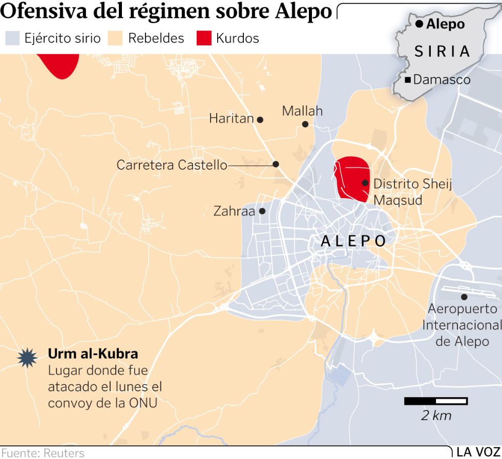 El régimen de Bachar al Asad se apresta a iniciar la ofensiva final sobre Alepo, después del fracaso de la tregua. Damasco anunció que a la arremetida aérea, donde está participando Rusia al tiempo que negocia con EE.UU., seguirá una ofensiva terrestre para retomar la parte de la ciudad en manos de los rebeldes. «Empezamos las operaciones de reconocimiento y los bombardeos aéreos y de artillería pueden durar horas o días, dependiendo de la situación en el terreno y de las pérdidas de los terroristas», aseguró una fuente militar.