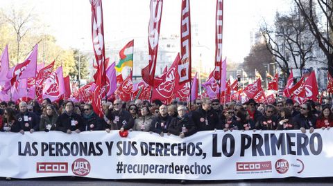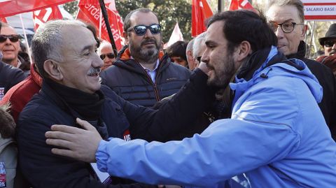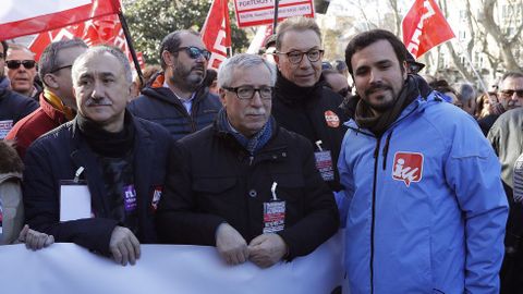 El secretario general de CC.OO. agradeció la presencia y el apoyo de los representantes políticos de PSOE, Podemos, Izquierda Unida (IU), Compromis Podem y En Marea, que llamaron a participar en estas movilizaciones en este momento «clave» para España, porque se está decidiendo la política presupuestaria para el año que viene y para el conjunto de reivindicaciones del movimiento sindical. Además, recordó que los sindicatos «hoy están aquí en defensa de los derechos, por los salarios, las pensiones y por la lucha contra la pobreza». Por su parte, el secretario general de UGT señaló que el país crece y que «cada día hay personas más ricas y más pobres en el país», por lo que apunta que «hay que repartir la riqueza» y que esta nueva legislatura es para los sindicatos «la de la recuperación de derechos».