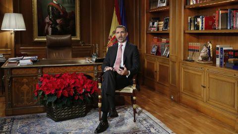 Con traje gris marengo, camisa blanca y corbata en tono rosa, el Rey ha pronunciado el mensaje sentado, con las piernas cruzadas, delante de la mesa y junto a una gran planta de flor de pascua roja situada sobre la alfombra para reflejar el ambiente navideño. Don Felipe también ha mostrado a su espalda la bandera nacional y la de la UE, que no apareció en sus dos mensajes anteriores.