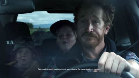 Cuando el coche de Jaime, en que el circula con sus dos hijos, toma la carretera para dirigirse hacia la zona de pesca, el anunciante muestra -en letra pequeña- una advertencia al espectador: «Este medicamento puede producir somnolencia. Se recomienda no conducir». La frase permanece durante unos segundos mientras el sufrido padre continúa su camino sorteando atascos de vacas y caminos encharcados.