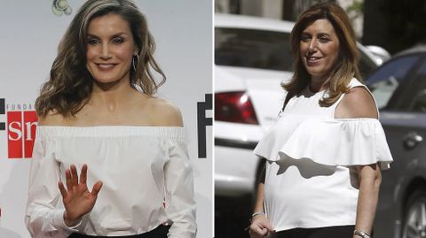 Además de coincidir en el modelo bicolor de la diseñadora venezolana, en los últimos días también se ha podido ver a la reina luciendo hombros durante una entrega de premios literarios en Madrid, con un atuendo muy parecido al que la presidenta andaluza eligió en mayo del 2015 para acudir a Ferraz y negociar los pactos electorales posteriores a los comicios municipales.