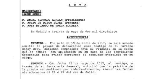 Así, el auto redactado por el juez Julio de Diego rechaza el argumento de Rajoy de que desplazarse hasta San Fernando de Henares comportaría un despliegue importante de recursos públicos, ya que «el tribunal no acierta a entender en qué consiste ese despliegue importante únicamente por el hecho de tener que desplazarse el testigo 18 kilómetros hasta la citada localidad». En cuanto a las razones de seguridad que adujo para declarar por videocoferencia, el tribunal reprocha a Rajoy que no explica cuáles serían esas medidas que tendrían que tomarse ni añade «mayor motivación o aclaración del porqué de dicha afirmación».