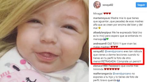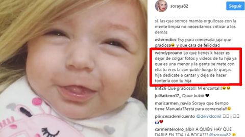 La pelea virtual continuó cuando la cantante decidió seguir por esos lides en las Stories de Instagram. Sin embargo, las críticas esta vez no le llegaron por haber puesto una peluca a su hija sino simplemente por darle biberón en lugar de pecho. «Que des biberón no te hace mala madre, sino, más bien una madre atrapada por el sistema... bendiciones para la nena que es inocente de las decisiones de sus padres», cuestionó una de sus seguidoras. Pero Soraya volvió a entrar al trapo y respondió enfadada, aunque esta vez sin insultos: «Querida, que no le de biberón es porque Dios no me ha dado leche en las tetas! ¿Algo que decir sobre ello?».