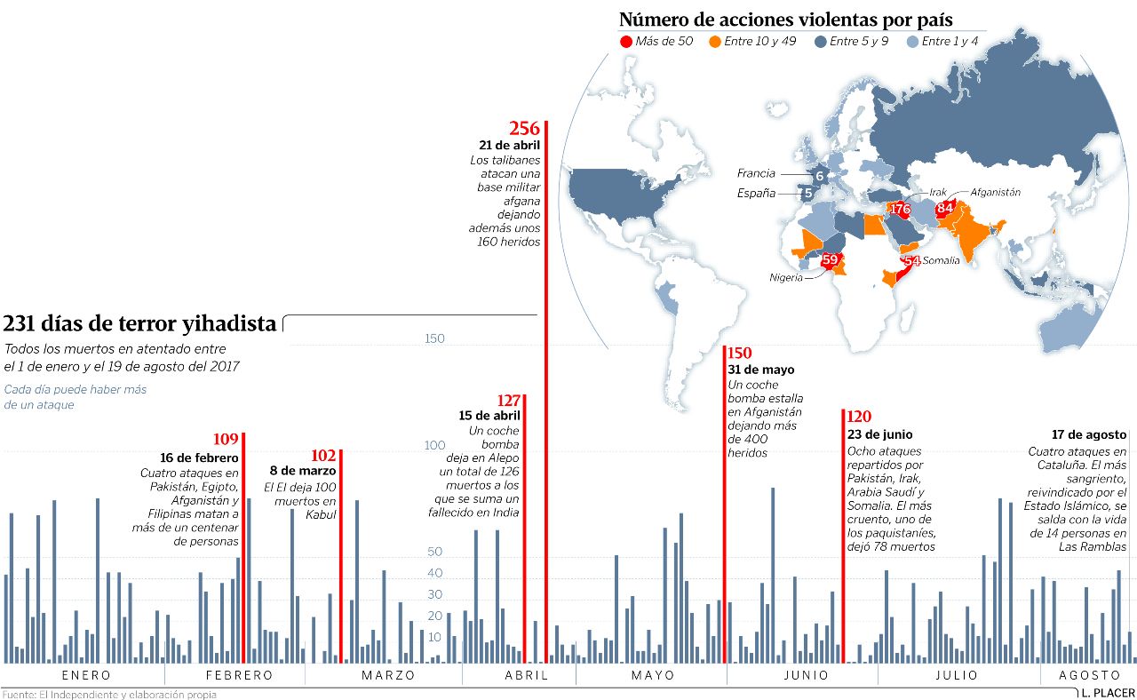 21 ago 2017 . Actualizado a las 10:12 h.El contador de atentados terrorista que Esri Story y PeaceTech Lab actualizan de forma permanente recoge que en todo el mundo se han registrado un total de 866 acciones definidas como terroristas en lo que va de año, con un saldo total de 5.224 muertos. Según esa misma fuente, casi el 75 % de los atentados (690) están vinculados de forma directa con grupos yihadistas a través de Al Qaida, el Estado Islámico o cualquiera de las marcas con las que los seguidores más radicales de estás organizaciones terroristas operan en los cinco continentes.