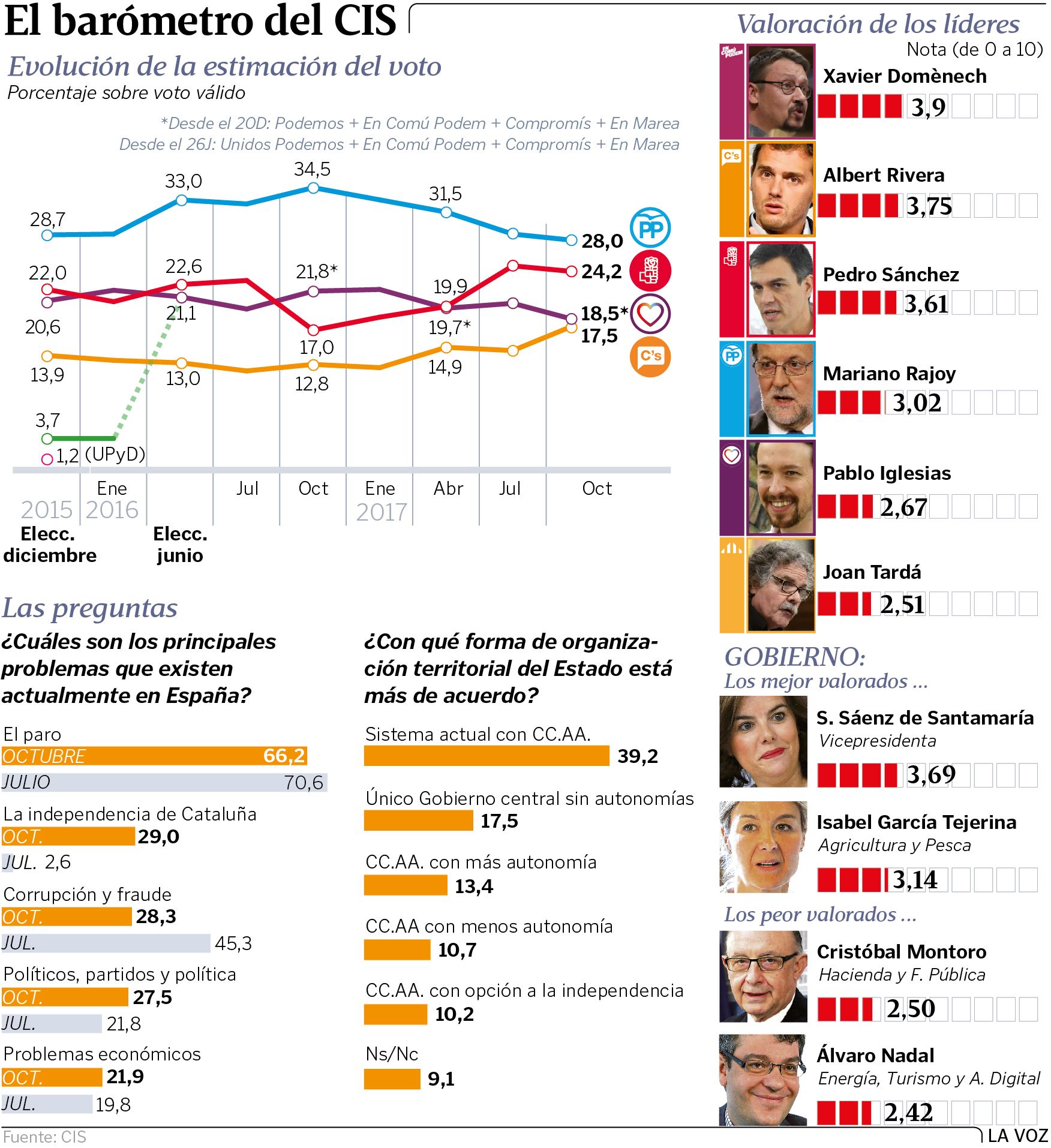 08 nov 2017 . Actualizado a las 01:17 h.El referendo ilegal de independencia celebrado en Cataluña hunde a Podemos, impulsa a Ciudadanos y no afecta a la pugna entre el PP y el PSOE, que mantienen las distancias. Esas son las principales conclusiones del último barómetro del Centro de Investigaciones Sociológicas (CIS), correspondiente al mes de octubre. La formación de Pablo Iglesias paga la ambigüedad de sus mensajes en torno al referendo y es la más perjudicada al dejarse casi dos puntos respecto al sondeo de julio, que le atribuía un 20,3 % de los sufragios frente al 18,5 % de octubre. Cataluña, sin embargo, impulsa el mensaje de dureza frente al desafío independentista sostenido por los naranjas de Albert Rivera, hasta el punto de que Ciudadanos pisa ya los talones a Podemos como tercera fuerza, con un 17,5 % de los votos, gracias a un crecimiento de tres puntos respecto al 14,5 % que el CIS le atribuía en julio.