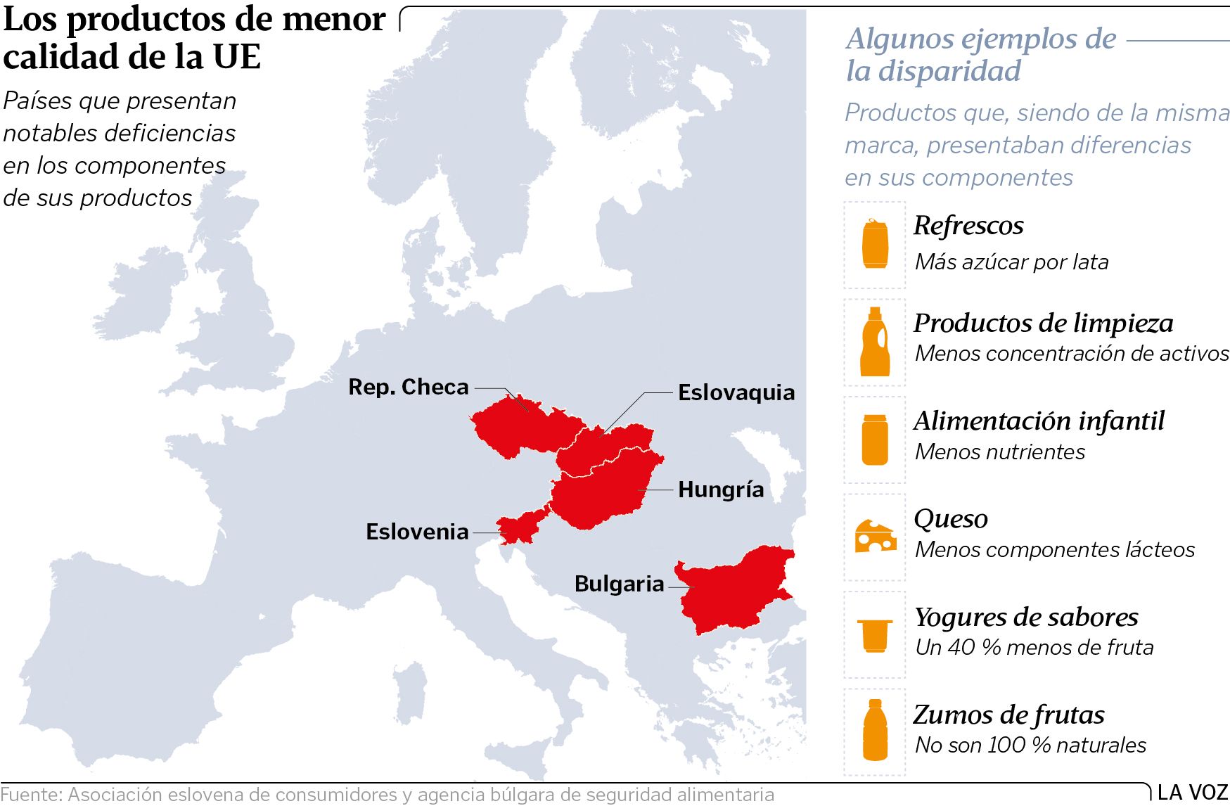 05 feb 2018 . Actualizado a las 08:55 h.Más azúcar en los refrescos, menos cacao en las chocolatinas y menos carne en la comida. Es lo que se encuentran los consumidores checos, eslovacos, húngaros, eslovenos y búlgaros cuando van a hacer la compra al supermercado. Las autoridades alimentarias de sus países acusan a las multinacionales de trazar un telón de acero entre la Europa occidental y la oriental. Los análisis realizados hasta el momento les dan la razón: existe un doble estándar en la calidad de los productos que se venden a un lado y al otro de esa línea invisible. Sus consumidores siempre salen peor parados. Los hay que conducen hasta Austria para hacer la compra en busca de mejores productos.