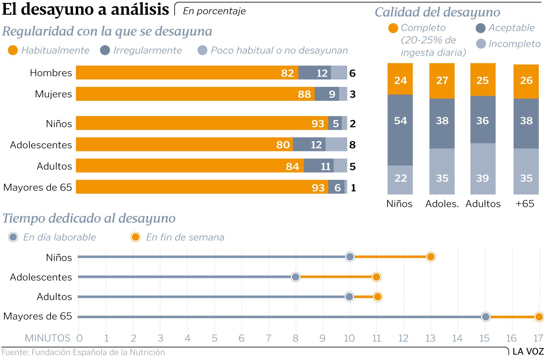 14 feb 2018 . Actualizado a las 09:53 h.Es, insisten los especialistas, la comida más importante del día, porque ayuda a reorganizar los cambios metabólicos ocurridos durante la noche, y debe cubrir entre el 20 % y el 25 % de las necesidades energéticas del día. Pero los españoles dedicamos muy poco tiempo a la primera ingesta diaria, una media de 11,2 minutos, y solo uno de cada cuatro españoles realiza un desayuno completo y adecuado, aquel que incluye al menos tres grupos de alimentos básicos, como la leche y sus derivados, cereales y frutas. Pero la situación es aún peor si se tiene en cuenta que un 5 % de los españoles, unos 2,3 millones, se lo salta directamente.