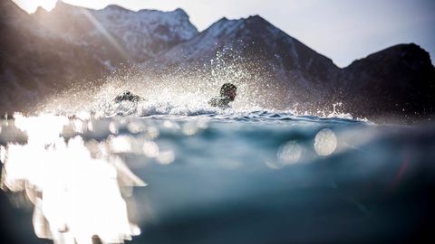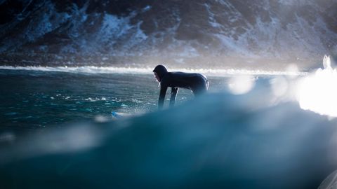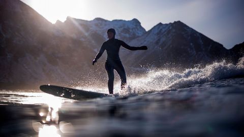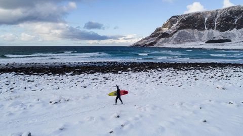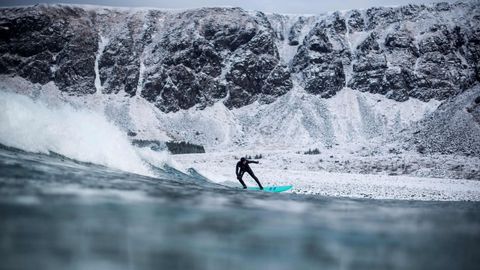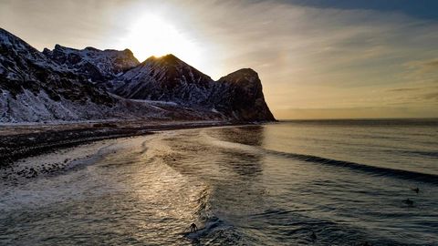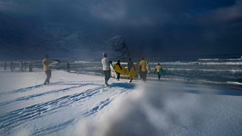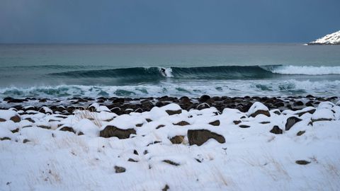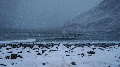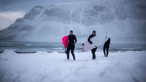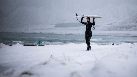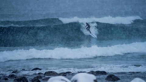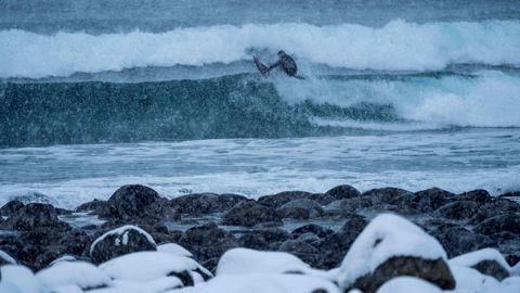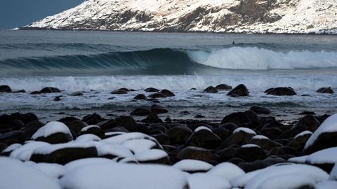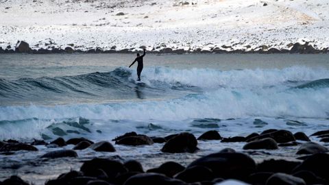 Varios amantes del surf desafían a las bajas temperaturas, dentro y fuera del agua, en las islas Lofoten, al norte de Noruega