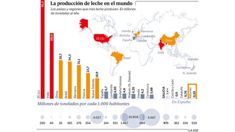 Con un volumen de leche de 552.000 toneladas anuales y poco más de un millón de habitantes, Asturias alcanza los 528 litros por persona. La cifra es elevada y en España solo presenta mejores números Galicia, ya que las 7.900 granjas gallegas consiguen alcanzar la tonelada de leche anual per cápita, solo superadas por las de la Bretaña francesa con casi 1.500 litros de leche por persona -4,8 millones de toneladas de materia prima producida el año pasado y una población de 3,2 millones de habitantes- y, principalmente, por varias regiones de Nueva Zelanda, primera potencia mundial exportadora de lácteos.