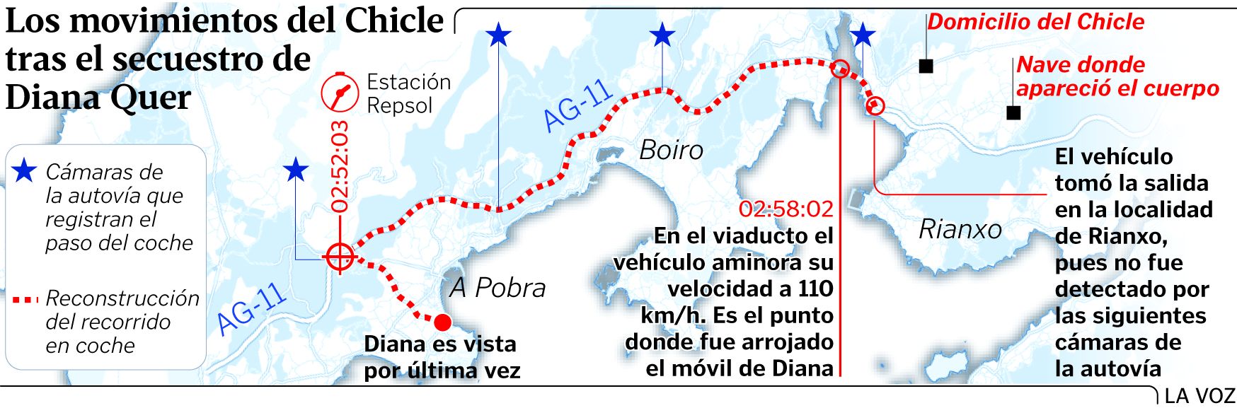 Los recorridos. En vista de que la reconstrucción de lo sucedido la noche de la desaparición de Diana se realizará según el relato del acusado, fuentes jurídicas consultadas dudan de que puedan aportarse datos muy relevantes para la instrucción de la causa. Sin embargo, esta prueba sí se considera útil para, por ejemplo, corroborar los tiempos. De la reconstrucción podría deducirse que el Chicle miente en algún aspecto si se comprueba que es imposible que realizara ciertos movimientos en un período de tiempo concreto. Por otro lado, el Ministerio Fiscal y la acusación particular solicitaron otra diligencia que el juez ha autorizado y que podría complementar a la que se realice hoy. Se trata de una recreación virtual de los movimientos que hizo el acusado la noche del crimen de acuerdo con datos objetivos, como la posición de los teléfonos móviles o las imágenes de las cámaras de seguridad o de tráfico que captaron sus desplazamientos. El resultado de esa prueba podrá contraponerse con lo que diga el Chicle para comprobar si existen contradicciones entre su relato y lo que muestran las pruebas.