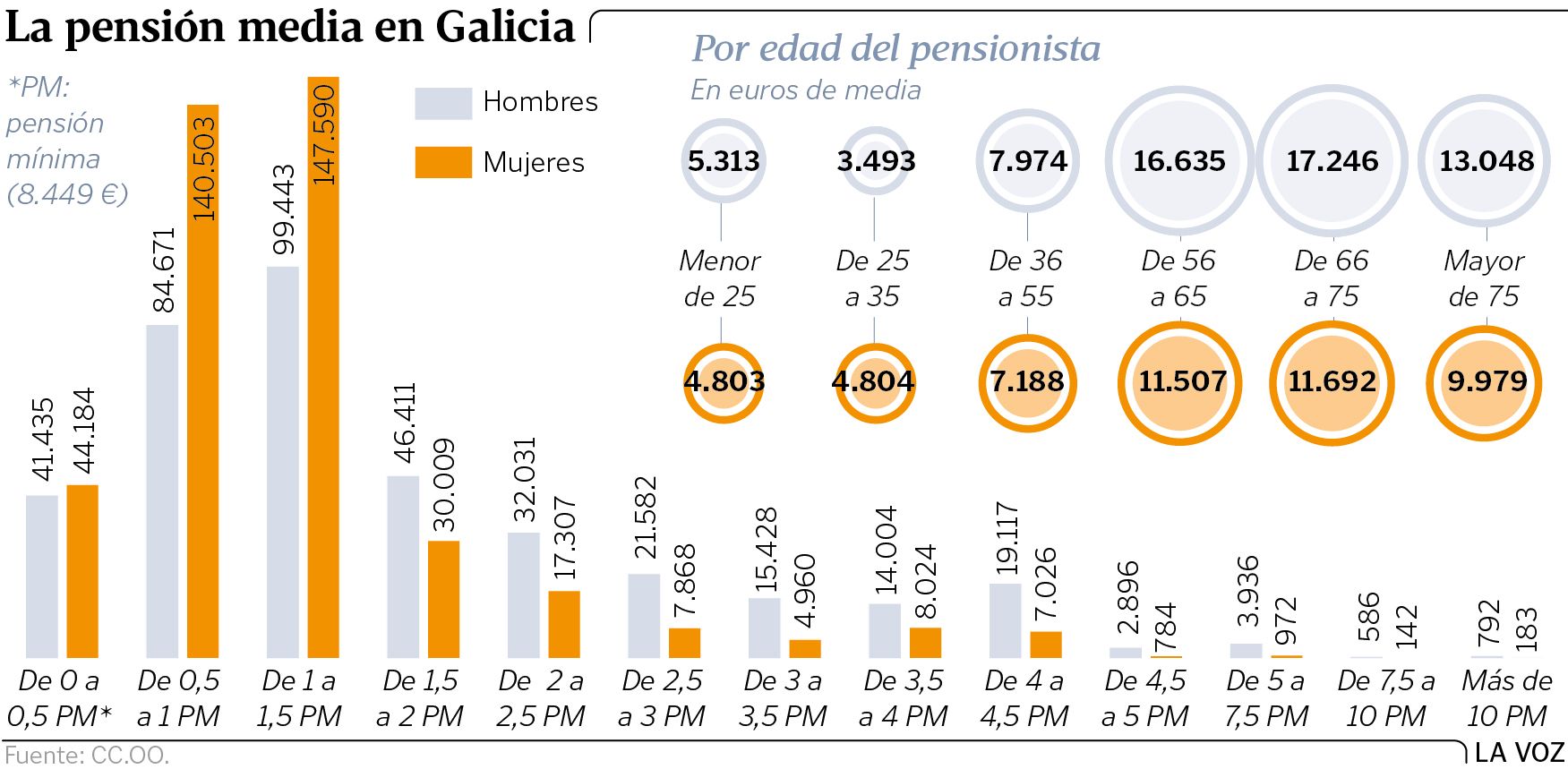 Una cosa es el medio de pago de la pensión y otra, muy distinta, su cuantía. Sobre esta última cuestión versa el informe publicado ayer por la secretaría de empleo de Comisiones Obreras en Galicia. Bajo el título As pensións galegas segundo as fontes tributarias, el departamento que dirige Maica Bouza analiza los datos que facilita la Agencia Tributaria para concluir que cuatro de cada diez gallegos que dependen de la Seguridad Social cobran una prestación que está por debajo del umbral de la pensión mínima (8.449 euros al año en el 2016).