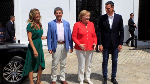 La canciller alemana, Ángela Merkel, ha llegado a las 13.00 horas al Palacio de los Guzmanes, sede de la Fundación Casa Medina Sidonia en Sanlúcar de Barrameda (Cádiz), donde va a celebrar un almuerzo de trabajo con el presidente del Gobierno, Pedro Sánchez. En la entrada del Palacio de los Guzmanes Merkel y su esposo, Joachim Sauer, han sido recibidos por Pedro Sánchez y su esposa, Begoña Gómez, ante la mirada de más de un centenar de curiosos, en una zona controlada por un fuerte dispositivo de seguridad.