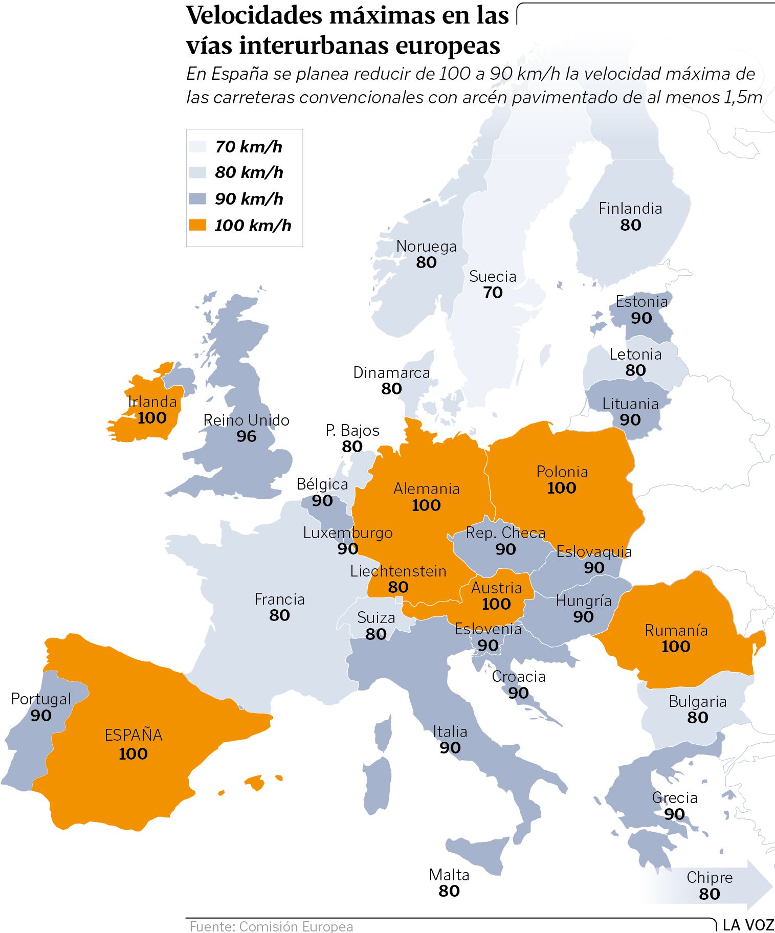 Con un proyecto serio detrás o sin él, el foco queda puesto sobre las carreteras que de modo genérico tienen una velocidad máxima limitada a 90 o 100 kilómetros por hora, donde se han registrado el 77 % de los muertos del verano, un porcentaje que se sostiene todo el año. El objetivo sería, sin dejar de insistir en otros aspectos como el alcohol, las drogas o los despistes al volante, reducir estos límites en diez kilómetros por hora, tal como ha hecho Francia este verano (ha bajado la velocidad de 90 a 80) imitando a los nórdicos y dejando atrás a otros países del entorno como Italia o Portugal, que están en 90, como buena parte de Europa, a excepción de Alemania, Irlanda, Austria, Polonia o Rumanía, que acompañan a España en el club de los 100.