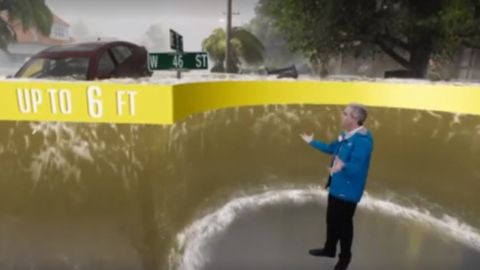 Cadenas como la CBS muestran el huracán en 3D sobrevolando el plató de las noticias meteorológicas, mientras que la especializada Weather Channel tira de todos los recursos que la tecnología pone a su alcance para avanzar los posibles efectos de la tormenta antes de que llegue a tierra. No solo muestra cómo una casa casi real se sacude con los azotes de un viento que hace que el tejado salga volando. También sitúa al locutor ante una espectacular subida del agua que lo supera en altura.