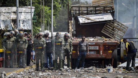Estos han sido los últimos movimientos de un fin de semana en el que la espiral de enfrentamientos en la frontera de Venezuela por el bloqueo de los camiones de la ayuda humanitaria provocó la muerte de al menos cinco personas, casi 30 heridos, medio centenar de detenidos y cerca de cien militares que desertaron de las filas bolivarianas para unirse al lado de Guaidó, según el balance facilitado por Migración Colombia y oenegés venezolanas de ayer por el mañana. Unos datos que no son definitivos porque a lo largo del domingo se produjeron más deserciones de las fuerzas armadas venezolanas hacia Colombia y Brasil.
