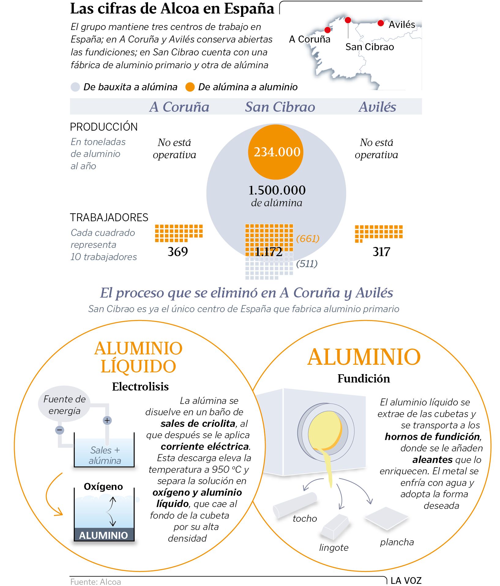 Los trabajadores llevaban meses con la mosca detrás de la oreja y la compañía también insinuaba que el panorama ya no estaba tan despejado para la que es aún su joya de la corona. El mal momento por el que atraviesa el mercado internacional del aluminio -una materia prima que cotiza en la bolsa de metales de Londres (LME)-, entre otros factores, debido al elevado precio de la alúmina con la que se elabora, junto a los importantes costes energéticos en España, provocó que San Cibrao perdiese dinero el año pasado por primera vez: 53,8 millones. Los números rojos en A Coruña sumaron 42 millones; y en Avilés, 40. Las fábricas de aluminio de estas dos últimas ciudades arrastraban varios ejercicios en negativo, según la empresa, por eso decidió tomar medidas drásticas: en febrero cerró las cubas de electrolisis en las que se elabora el aluminio para parar la sangría económica y solo están operativas las fundiciones de ambas plantas.