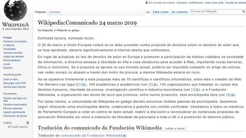 La Galipedia, la comunidad de la Wikipedia en gallego, permanecerá «apagada» durante tres días en protesta por una propuesta de directiva que «danaría significativamente a Internet abierta que coñecemos». Tal como ha explicado en un comunicado, la directiva «ameaza» la libertad en línea y «crea obstáculos» para acceder a la web, «impoñendo novas barreras, filtros e restriccións».