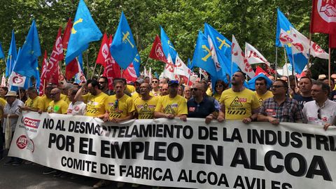 Los trabajadores asturianos finalizaron ayer en Madrid la que denominaron marcha del aluminio, tras la cual se manifestaron ante el Ministerio de Industria. El secretario general de Industria en funciones, Raúl Blanco, recibió a una representación.