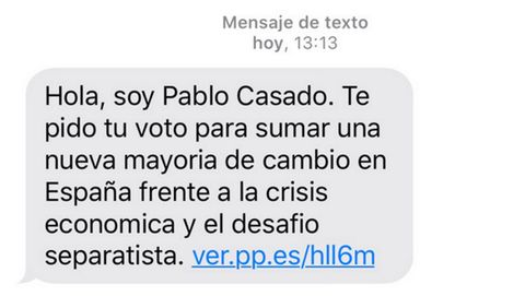 «Hola, soy Pablo Casado, te pido tu voto para sumar una nueva mayoría de cambio en España frente ala crisis económica y el desafío separatista», señala el mensaje del líder popular en esta recta final de campaña, al que ha tenido acceso Europa Press.