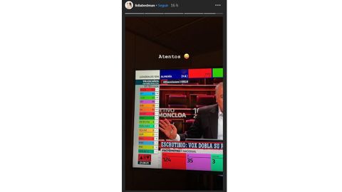 En esta ocasión, con la formación convertida en la tercera fuerza política de España, ha roto esa norma no escrita. No solo ha publicado esa imagen, anoche también compartía una foto hecha a su propio televisor con una palabra, «Atentos», acompañada de un emoticono sonriente, en la que se veía crecer el número de escaños de Vox.