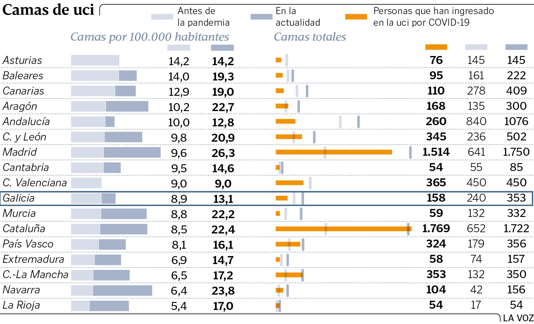 Los datos sobre la disponibilidad de camas y, por tanto, la capacidad de que aguanten de manera razonable para atender los casos de coronavirus y el resto de las patologías más graves, también se prestan al equívoco. Antes del inicio de la crisis, la comunidad tenía en el sistema público 166 plazas de uci, con una de los ratios por habitante más bajas de España. Ahora bien, la relativa anticipación de la Xunta le permitió ampliar la capacidad hasta las 274, a las que habría que sumar las 79 con las que cuentan los hospitales privados.
