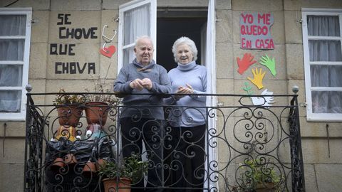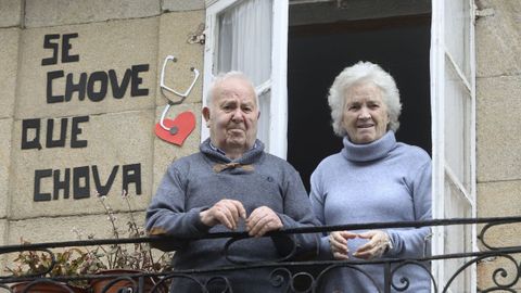 Además, Eugenio y Carmen se afanan con las manualidades al realizar los coloristas mensajes que cuelgan en su balcón. Empezaron con «Quédate en casa» y «Se chove, que chova», y ahora lucen también un fonendo y un corazón, su llamada a la defensa de la sanidad pública, y una paloma con la rama de olivo, su manera de recordar que, aunque no lo parezca, estamos en Semana Santa.