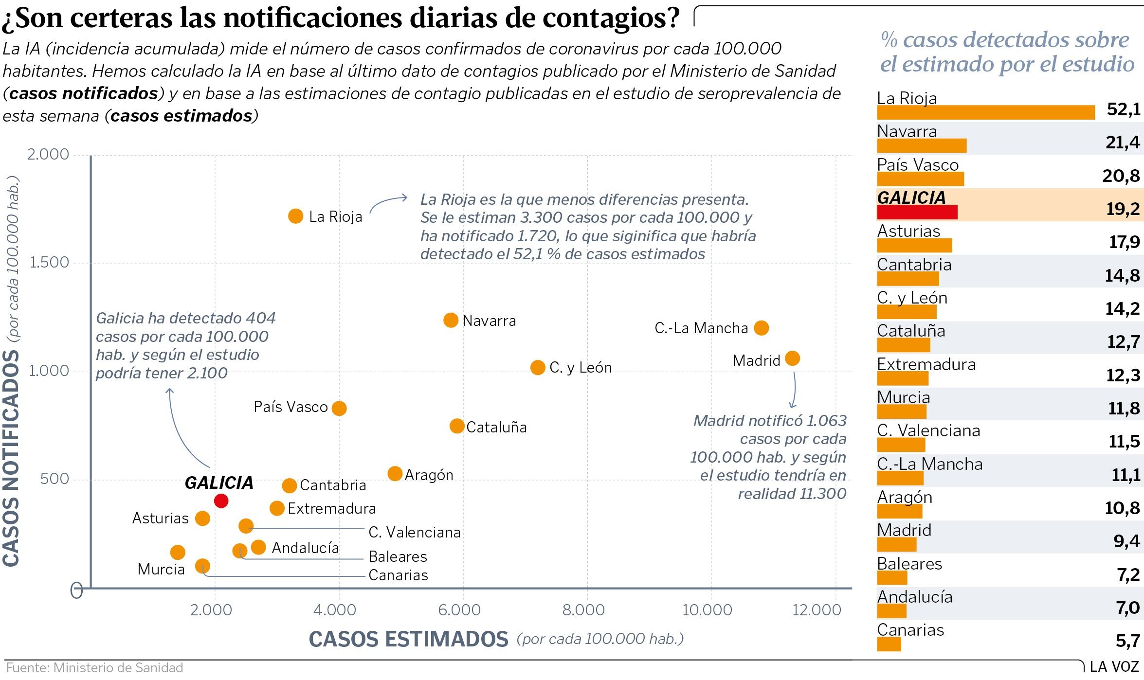 El otro factor que influye en esas notificaciones es la creciente capacidad de detección, que el epidemiólogo ilustró con varios gráficos. Por ejemplo, La Rioja fue durante muchas semanas la comunidad que registraba una incidencia acumulada de casos más alta. Sin embargo, ahora que esos datos se han podido cruzar con los del estudio epidemiólogo queda en evidencia que la realidad era bien distinta. En la comunidad autónoma únicamente se ha infectado el 3,3 % de la población, según los primeros resultados preliminares, por lo que está en la parte media baja de la tabla a nivel nacional. De ahí que sus registros respondan a que ha tenido una efectividad a la hora de detectar casos sospechosos y hacer las pruebas muy superior al resto, de entorno al 40 % de los casos totales.