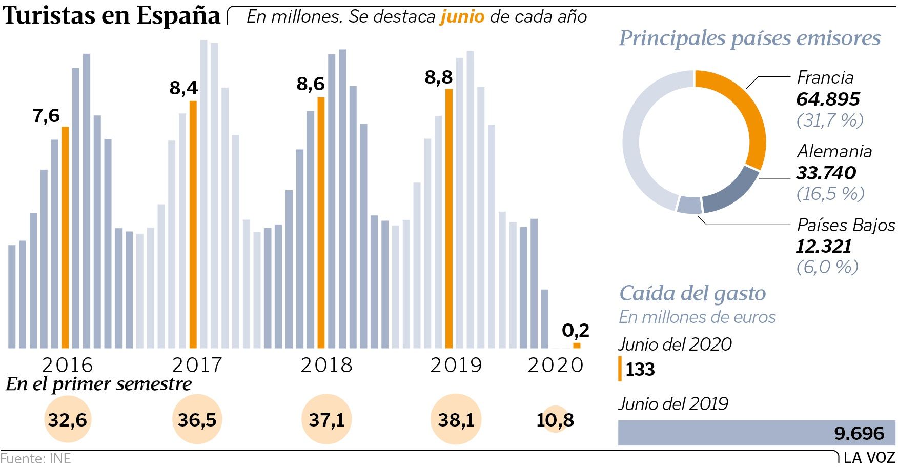 06 ago 2020 . Actualizado a las 00:07 h.El pasado 21 de junio finalizó el estado de alarma. Las fronteras se abrieron al turismo nacional e internacional, sobre todo el europeo. Después de tres meses de confinamiento, hoteles y restaurantes pudieron abrir de nuevo sus puertas, conscientes de que no amasarían los jugosos ingresos del año anterior, cuando España dio la bienvenida a casi 84 millones de turistas extranjeros.