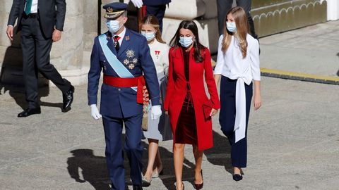 Para acudir a los actos del día de la Hispanidad , la reina ha escogido un conjunto en rojo que estrenó en el año 2018, cuando el rey le entregó a la princesa Leonor el Toisón de Oro