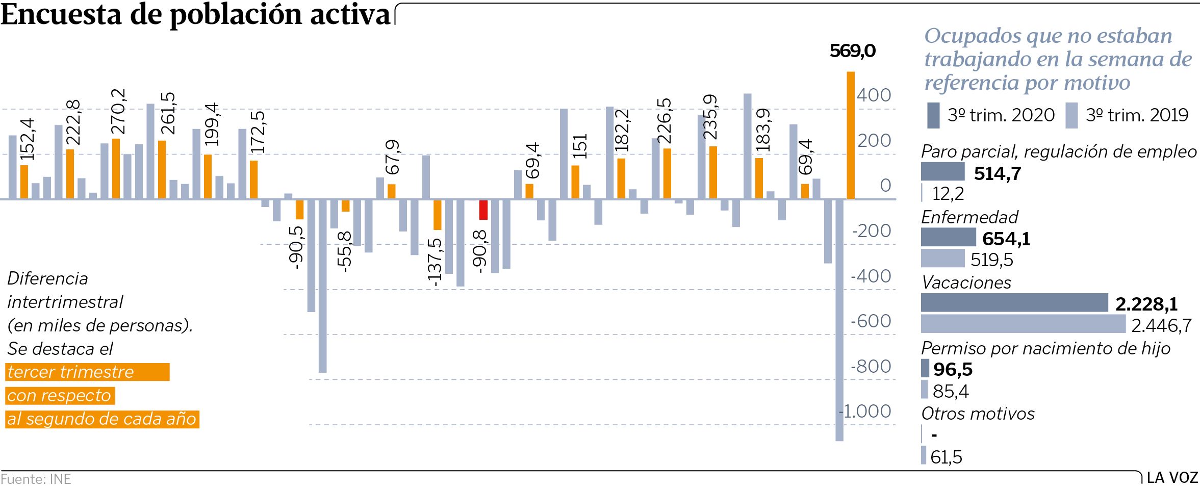 28 oct 2020 . Actualizado a las 09:32 h.Tocaba recuperarse de un segundo trimestre del año marcado por el confinamiento y la inactividad. Y llegó el tercero con un efecto rebote en la creación de empleo, que, con todo, se quedó corto. La EPA (encuesta de población activa que elabora el INE) confirma que entre junio y septiembre hubo un proceso de reincorporación al mercado laboral que se corresponde, fundamentalmente, con la temporada turística. Solo por eso, esos tres meses arrojan cifras positivas. Porque si comparamos esta etapa de nueva normalidad con el mismo trimestre del 2019, la realidad es más dura: Hay 19,18 millones de personas ocupadas, 700.000 menos que entonces.