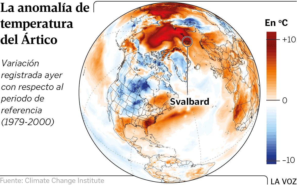 Con la llegada del otoño, lo habitual en el extremo norte del hemisferio boreal es que el hielo vaya avanzando, pero no lo está haciendo como debería porque el termómetro sigue alcanzando máximas muy poco habituales. El pasado miércoles 11 de noviembre, en el archipiélago noruego de Svalbard, la región poblada más al norte del mundo, una estación meteorológica situada en la montaña de Reindalspasset registró un valor de 9,4 grados.