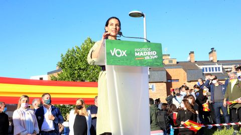 Santiago Abascal y Rocío Monasterio entraron en la plaza Víctimas del Terrorismo con su himno de película épica y rodeados de la euforia habitual de sus mítines, solo que esta vez sin manifestantes a los que señalar y con la comodidad de jugar en casa. Aquí Vox sumó cien votos menos que el PP en las últimas generales y fue segunda fuerza, con el 26,5 % de los sufragios. La candidata, sin embargo, quiso recordar los innumerables atrancos que, según ella, pone el Gobierno a su campaña. «Ataques, piedras, es que no pueden con nosotros. Están desesperados», se rio Monasterio con la complicidad de los asistentes, todos ellos con algún símbolo del partido o de España en sus banderas, mascarillas o prendas de vestir, arruinando el negocio improvisado que varios feriantes dispusieron en la plaza. «Nah, no vendo ná. Mucha pasta —la renta aquí es una de las más altas de la comunidad—, pero no gastan», se resigna un hombre que oferta pulseras de Vox a tres euros, dos por cinco. Lo mismo el resto de compañeros, que se quejan de que no pueden ir al mercado ambulante y han optado por seguir a Abascal y Monasterio allá donde vayan para vender sus productos.