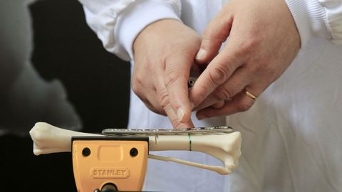 Con este sistema los alumnos pueden aprender, por ejemplo, cómo es el sistema para trabajar en una fractura de tibia o de fémur. En primer lugar, en cada hueso hay una marca en la que los alumnos pueden romper para iniciar luego la recomposición. En el laboratorio, además, hay tornillos que deberán colocar y una broca para esa operación.