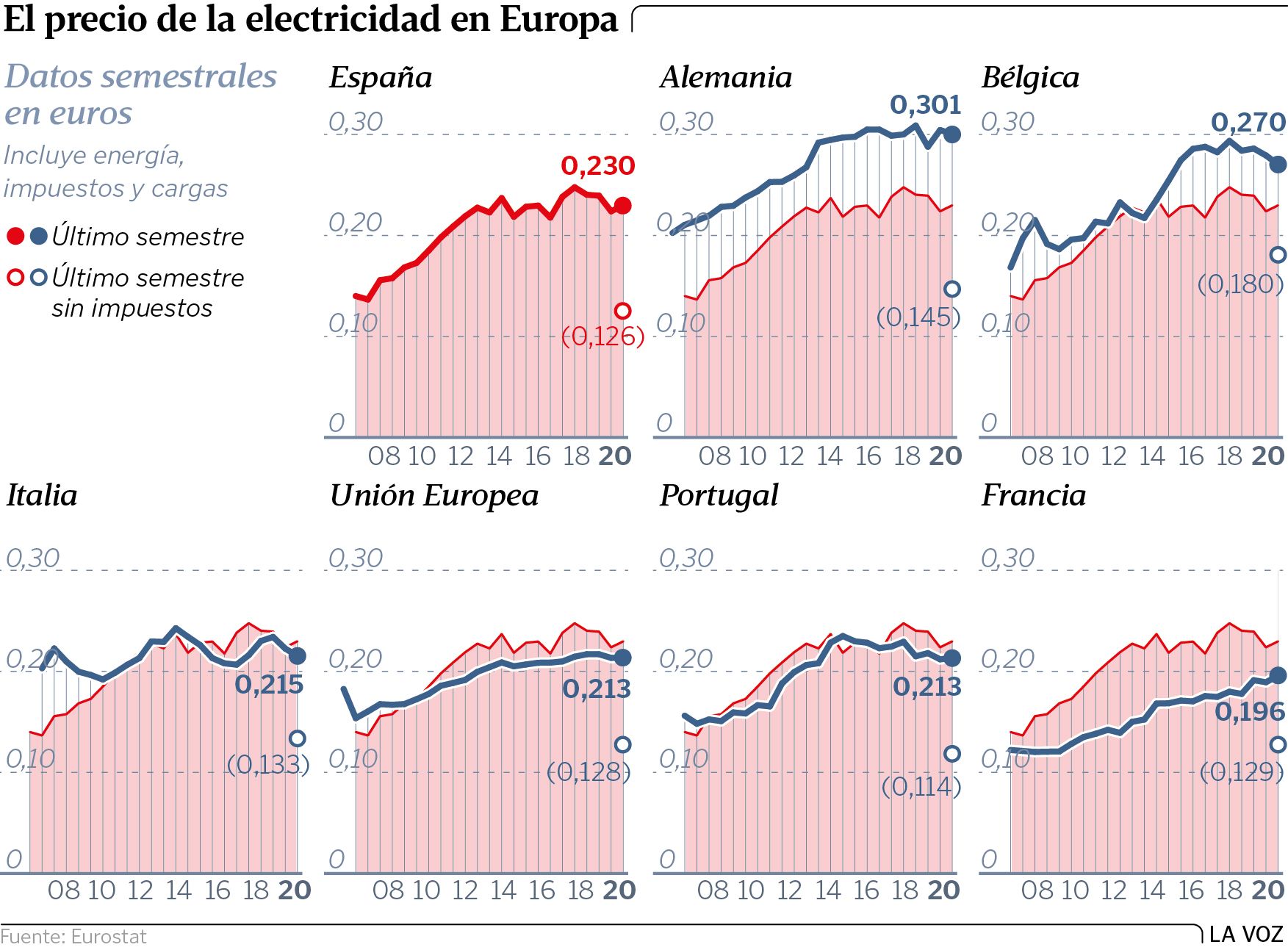 Impuestos bajos. Alemanes y españoles miran con envidia al país galo, que no solo consume energía, también la exporta, algo impensable en España. Y eso tiene que ver con su apuesta por la energía nuclear, que proporciona el 80 % del total de la demanda. Eso le permite tener un mix energético bajo en carbono. De hecho, desde el año 1990 aumentó un 21,09 % su producción de energía mientras reducía un 12,9 % las emisiones de CO2, según la Agencia Internacional de la Energía. Desde el 2007 su mercado está liberalizado y los franceses pueden recurrir a las tarifas reguladas o libres. Solo el 40 % del precio que pagan los franceses son cargos por el uso de la red. El IVA es del 20 %, aunque lo rebajan al 5,5 % para la gente mayor. Algo similar a lo que hace el Reino Unido, que aplica el general del 20 % para negocios y el 5 % para el uso doméstico. Al final, el precio del kWh (0,1958 euros), permite a los vecinos galos mantener a raya su factura: 489,5 euros. Y eso que los picos de consumo franceses son los más altos de Europa. Eso sí, las jornadas de calma chicha en Francia podrían tener los días contados porque su parque nuclear está envejecido y cada vez es más caro: «El precio en las subastas de energía eléctrica de renovables en España son menos de la mitad del coste de las nucleares francesas, así que a largo plazo utilizaríamos interconexiones, no para comprar energía a Francia, sino para venderla».
