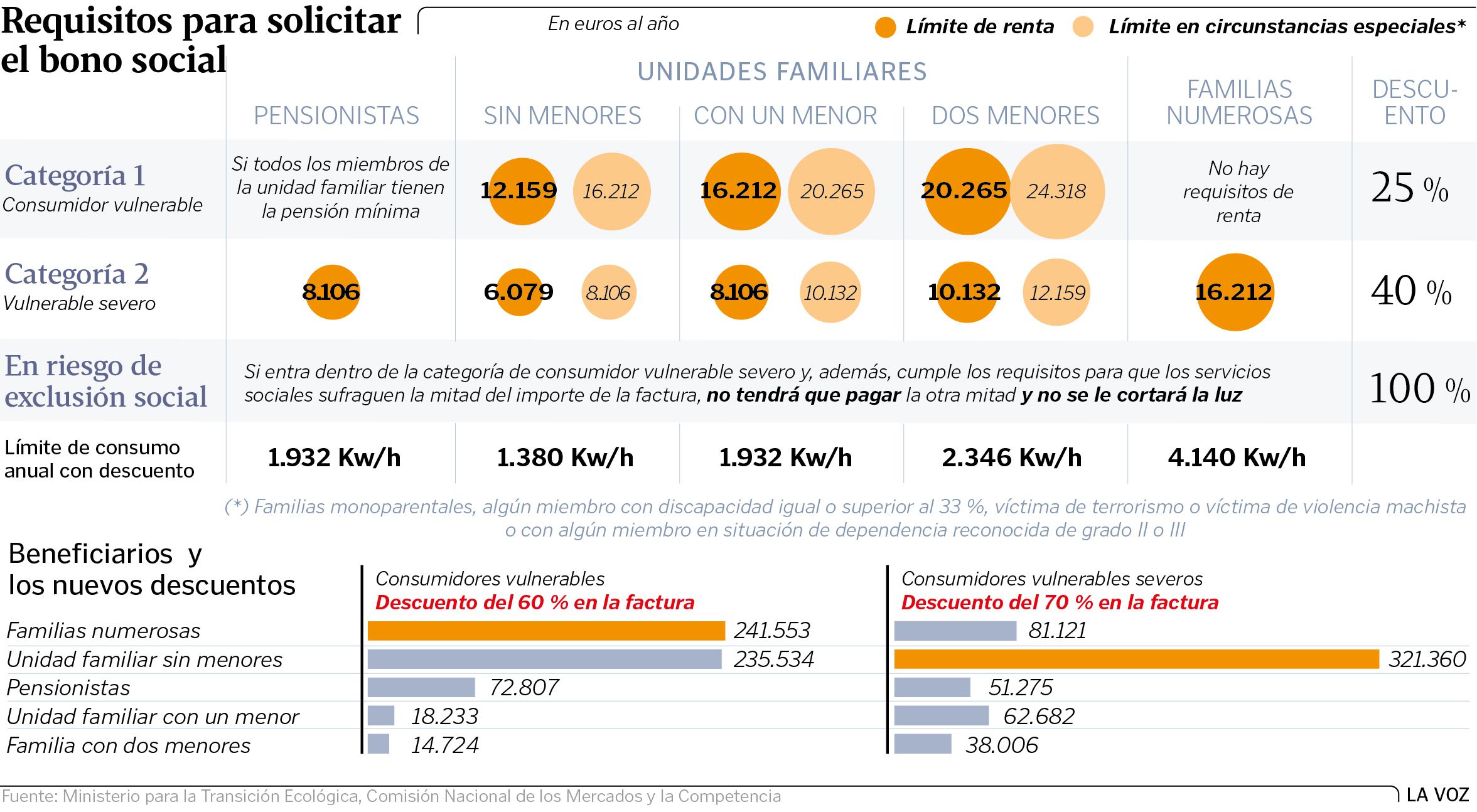 Son considerados consumidores vulnerables aquellos cuya renta conjunta anual de la unidad familiar sume un tope de 12.159,42 euros y no tengan hijos. Si hay un menor, el umbral sube a 16.212,56; y si hay dos, a 20.265,70 euros. También entran en esta categoría las familias numerosas sea cual sea su renta y aquellos hogares en los que todos los miembros con ingresos sean pensionistas del sistema de la Seguridad Social (jubilación o incapacidad permanente) y perciban por ello la cuantía mínima vigente en cada momento. Aparte, a esos umbrales se les suman 4.053,14 euros anuales si en la familia hay algún miembro con discapacidad reconocida igual o superior al 33 %; en situación de dependencia de grado II o III; si acredita ser víctima de violencia de género; del terrorismo y si se trata de una familia monoparental.