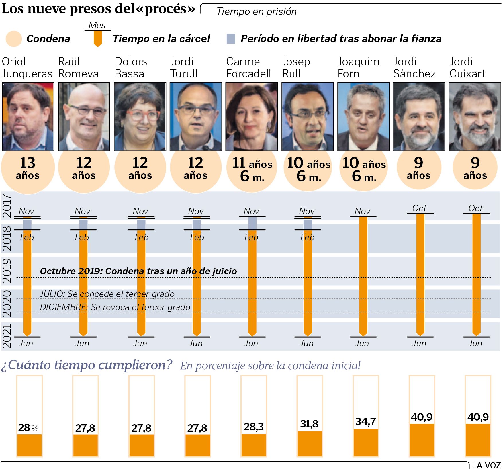 Jordi Sánchez (expresidente de la ANC y actual secretario general de Junts) y Jordi Cuixart (expresidente de Òmnium Cultural) fueron los sentenciados que más porcentaje de la condena han cumplido, un 40,9 %. Ambos fueron condenados a nueve años de prisión y pasaron tres años y ocho meses, el mismo tiempo que el exvicepresidente Oriol Junqueras, pese a que este recibió la condena más elevada, 13 años por sedición y malversación, con lo que se queda en un un 28 %. Les sigue el exconsejero Joaquim Forn, condenado a 10 años y seis meses por sedición, de los que también cumplió solo tres años y ocho meses (un 34,7 %); y Josep Rull, sentenciado a 10 años y medio, de los que estuvo preso tres años y cuatro meses (un 31,8 %).