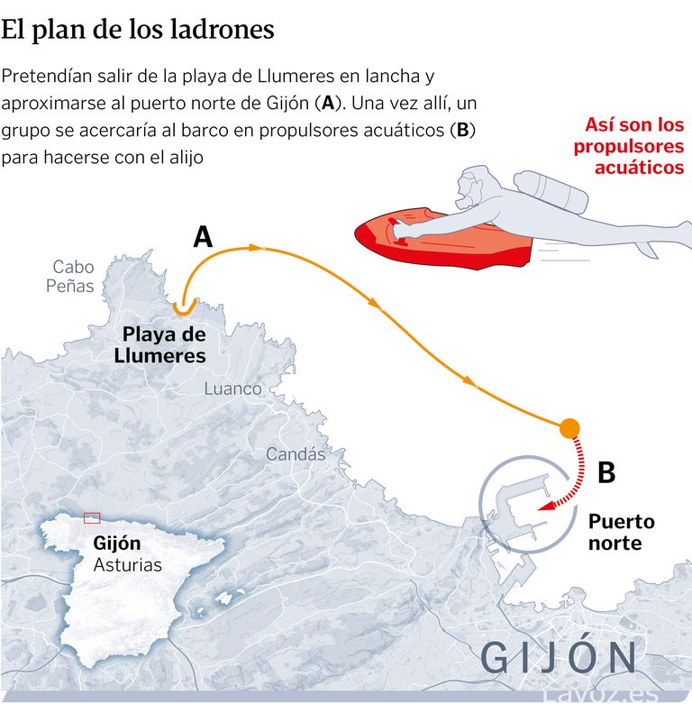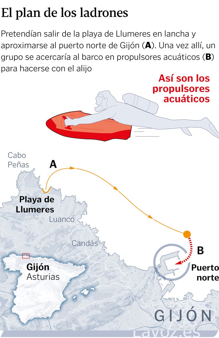 El 27 de enero del 2022 trascendió que el Nehir sería destripado para desvelar si escondía 60 millones de euros más en cocaína. Un suculento botín que sus propietarios no estaban dispuestos a perder. Contactaron con varias organizaciones de narcotraficantes en España para que, a cambio de dinero o mercancía, se sumergieran y retiraran hasta el último fardo. Tres días después, el 30 de enero, a 30 kilómetros por carretera del puerto de Gijón y a 14 kilómetros por mar, en la playa de Llumeres (municipio de Gozón), se identificó a 11 vecinos de la provincia de Vizcaya. Primero, en el mirador sobre el arenal, junto a un coche con remolque para embarcaciones propiedad de una integrante del grupo. Luego, en la playa, con una lancha de tres metros de eslora, equipos de buceo y propulsores marítimos con hélice a motor para moverse con soltura bajo el agua.