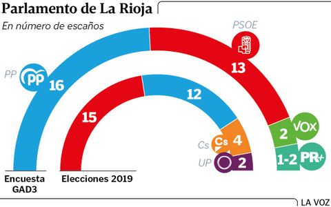 Con todo, el último sondeo de GAD3 arroja cifras en las que tanto PP como PSOE dependerían de otros partidos para conformar el Ejecutivo de la novena legislatura riojana. Dicho sondeo sitúa en lo alto del podio electoral al PP de Gonzalo Capellán con 16 escaños, a falta de uno para lograr gobernar en solitario. Ganaría así cuatro representantes respecto al 2019. El PSOE pasaría de 15 diputados a 13 y se situaría como segunda fuerza, aunque los números no posibilitarían un Gobierno de izquierdas. Máxime cuando el sondeo da por desaparecida la representación de Unidas Podemos en el parlamento autonómico. No podría conservar sus dos diputados y, junto con Ciudadanos, que perdería cuatro, se quedaría fuera de la próxima legislatura.