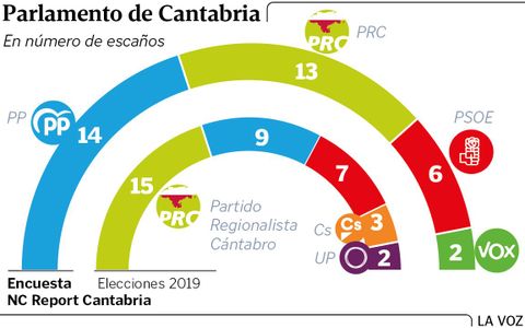 El PP, dirigido por María José Sáenz de Buruaga desde los anteriores comicios, lograría un ascenso de nueve a 14 diputados, siendo la fuerza que mas crece gracias al deceso regional de Ciudadanos, que perdería sus tres diputados, y el voto captado del centro. Vox irrumpe con dos representantes y Unidas Podemos desaparecería también. La distancia entre bloques es de dos escaños, un resultado ajustado que puede alterar la gobernanza de Cantabria si el bloque de izquierdas no juega bien sus cartas.