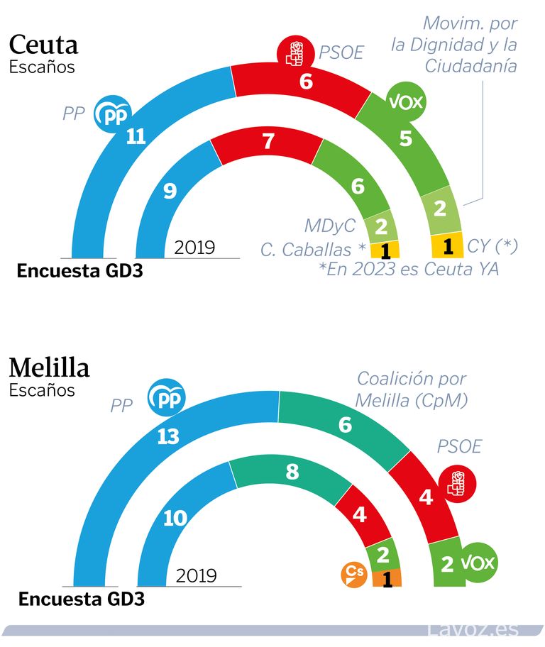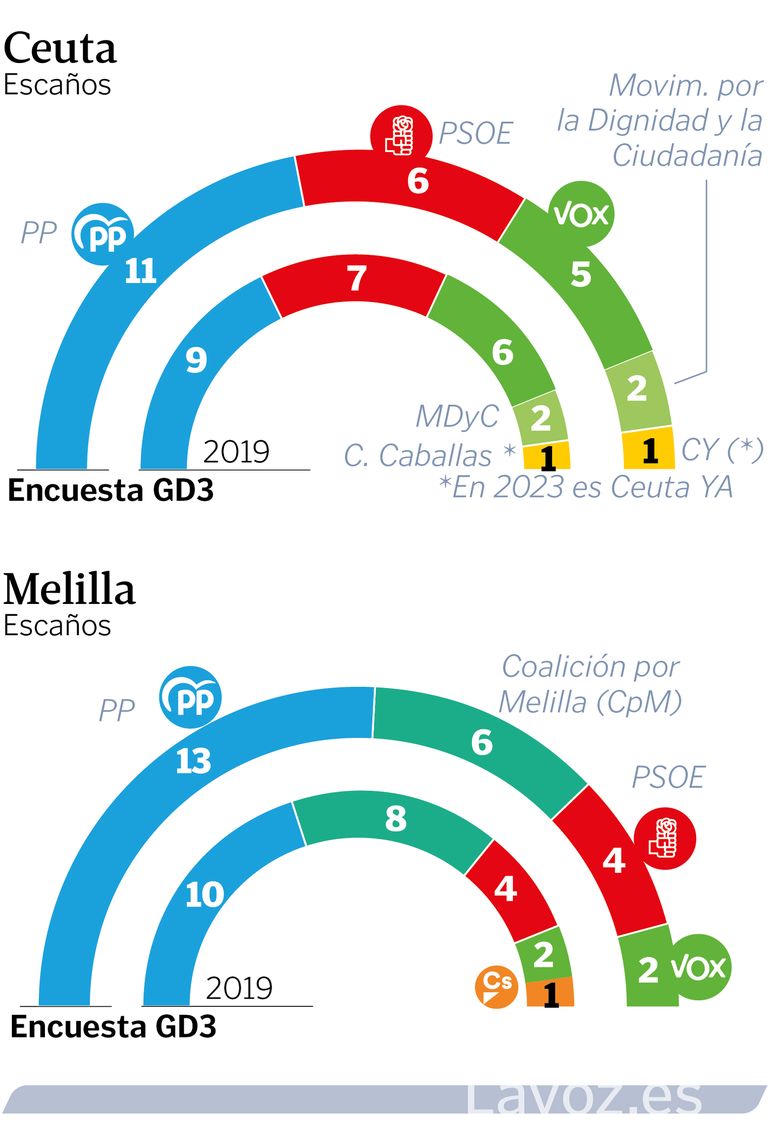 El último sondeo de GAD3 para Ceuta indica que el PP se haría con la victoria al pasar de nueve a 11 diputados, mientras que el PSOE caería de los siete a seis. Vox también caería de seis representantes a cinco. MDyC conservaría sus dos diputados al igual que Ceuta Ya!, que conserva tan solo uno. La suma de las derechas resolvería la gobernanza a favor de Juan Vivas, que lleva al frente de Ceuta desde el 2001, uno de los políticos más veteranos en su cargo. Por otro lado, en Melilla el resultado sería similar al de su vecina. El PP subiría de los 10 diputados a 13, mientras que el PSOE se mantendría en cuatro. A su vez, Coalición por Melilla (CpM) perdería dos y pasaría de tener ocho a seis. Vox mantendría sus dos representantes a la vez que, curiosamente, Ciudadanos, partido que evita su defunción política, al contrario que en el resto de la geografía española. Eso sí, sin su candidato habitual, Eduardo de Castro, que está imputado por un caso de corrupción.
