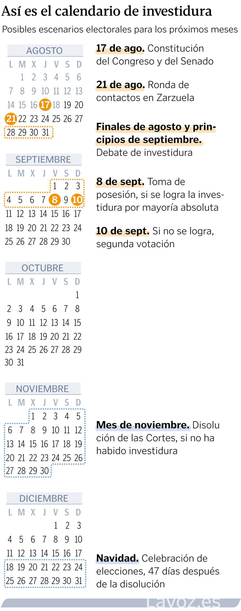 La deliberación de Felipe VI desembocará en una sesión de investidura que podría llegar a celebrarse en la primera semana de septiembre. Si el candidato propuesto —solo puede haber uno tras esta ronda— no obtiene la mayoría absoluta del Congreso, la votación se repetirá a las 48 horas. Hace tres años, Sánchez era investido por mayoría simple de esta forma.