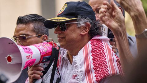 El líder colombiano ha participado este viernes en una manifestación propalestina que ha tenido lugar en Nueva York, coincidiendo con la celebración de la 80 Asamblea General de la ONU. En esta marcha —en la que se encontraba junto al cofundador de la banda británica Pink Floyd, Roger Waters—, Petro se ha dirigido a los soldados estadounidenses para pedirles que no obedecieran las órdenes. «Le pido a todos los soldados del Ejército de Estados Unidos no apuntar contra la humanidad sus fusiles. Desobedezcan la orden de Trump. Obedezcan la orden de la humanidad», ha expresado con un megáfono ante la multitud congregada en las calles de la ciudad estadounidense.