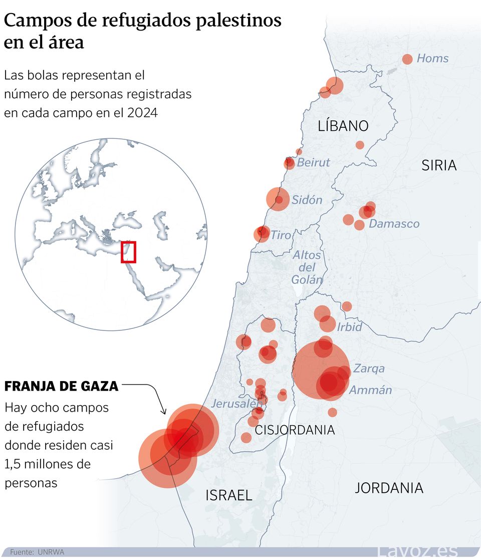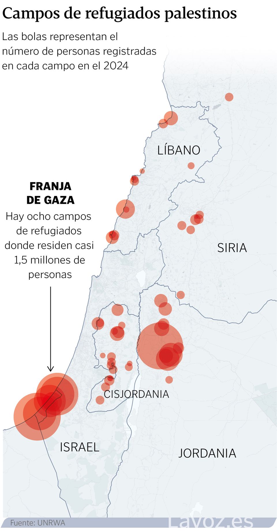 El éxodo de estos palestinos dio lugar a la creación de 58 campos de refugiados por todo el Levante gestionados por la Agencia de las Naciones Unidas para los Refugiados Palestinos en Oriente Próximo (UNWRA, por sus siglas en inglés). La mayoría de ellos en Cisjordania y Gaza, pero también se repartieron en Damasco, como el que se convirtió en el barrio de Yarmouk; o en Baqa’a (Jordania) y Ain al Hilweh (Líbano), entre otros. La proximidad de estos campos con la ciudadanía, la precariedad en la que viven los palestinos, la condición de apátridas y la conciencia con la que los árabes viven el conflicto palestino explican por qué el 92 % de la sociedad de los países árabes apoya al pueblo palestino y el 89 % se opone a normalizar relaciones con Israel, según el Doha Institute.